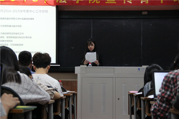 大会分为两半场。上半场会议伊始,yl8cc永利官网宣传中心第一届主任舒雪作2014-2015学年度中心工作总结,跟大家分享了宣传中心从“白手起家”到成长为越发成熟的yl8cc永利官网官方机构的历程,定位当下,总结不足,展望未来。