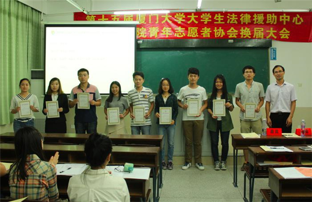 2015年10月19日晚7点,第十五届厦门大学大学生法律援助中心暨yl8cc永利官网青年志愿者协会换届大会在永利官网拉开帷幕。永利官网党委副书记郭锦星老师、团委书记高斌老师,辅导员宋磊华老师参加了本次换届选举会议。会议由第十四届法律援助中心副主任关蕴珈主持。