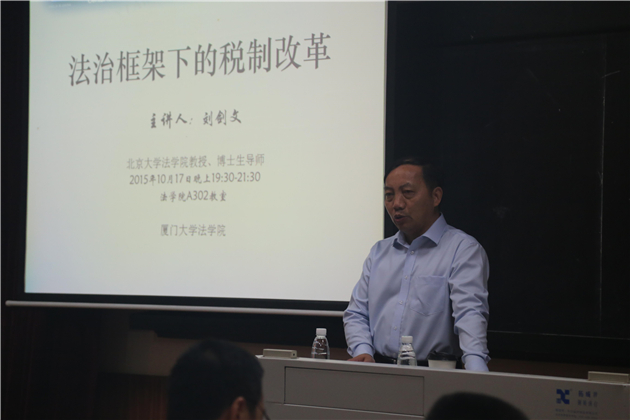 2015年10月17日晚上7点30分,“法治框架下的税制改革”的主题讲座在yl8cc永利官网A302教室举行,主讲人为北京大学法学院教授、中国财税法学研究会会长刘剑文教授。本次讲座由yl8cc永利官网副院长朱炎生教授主持,yl8cc永利官网的诸多老师、学生全程听了此次讲座。此外,本次讲座还吸引了厦门市国税局的领导与职工前来参加。