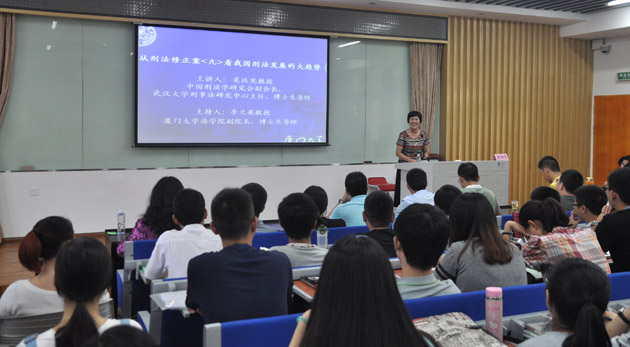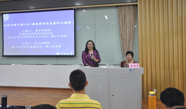 金秋十月的厦门阳光恬静,柔风和煦,送走国庆长假的络绎宾客,yl8cc永利官网又迎来一场不同凡响的学术盛宴。10月8日的下午三点,中国刑法学研究会副会长、武汉大学刑事法研究中心主任莫洪宪教授应厦门大学经济犯罪研究中心的邀请,在yl8cc永利官网137报告厅为yl8cc永利官网学子带来了一场题为“从《刑法修正案(九)》看我国刑法发展的大趋势”的学术讲座。yl8cc永利官网副院长、博士生导师李兰英教授出席并主持本次讲座,刑法教研室全体教师、博士生、硕士生参与并聆听了讲座。同学们的积极参与使得会场内座无虚席,盛况空前。