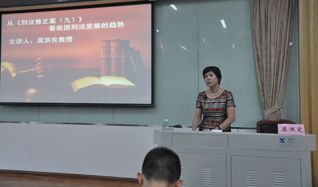 莫教授开场首先介绍了本次《刑法修正案(九)》的修改背景,认为本次修法贯彻了统一刑法典的精神,进一步彰显保护人权的理念,也体现了国内刑事立法逐步与国际公约相接轨的趋势。接下来,她重点围绕《刑法修正案(九)》中死刑改革、反恐立法、反腐制度这三大问题展开主题演讲。在死刑改革方面,继《刑法修正案(八)》废除13个罪名的死刑之后,《刑法修正案(九)》又取消了九个罪名的死刑,反映了当前我国废除死刑的总体趋势并未改变。在总结了死刑改革的基本特征后,莫教授进一步分析了未来死刑改革的方向。在反恐立法上,她总结了反恐刑法的历次修改的价值以及特色所在,在放眼域外设立宣扬恐怖主义犯罪以及预备行为实行行为化的经验同时,也深入反思我国反恐刑法的完善路径;在反腐刑事改革上,莫教授深入浅出地阐述了修正案关于贪腐类罪名修改的内容、特点,对反腐败刑事法治的完善以及同其他刑法规范的协调建言献策,并对严重腐败犯罪死缓犯的终身监禁制度等焦点问题提出了独到见解。此外,莫教授还对修正案中涉及的其他重大问题进行了逐一介绍,其中包括了侵犯公民人身权利犯罪、网络犯罪、失信背信犯罪、危害社会管理秩序犯罪、加大对未成年人权益保护等诸多方面。