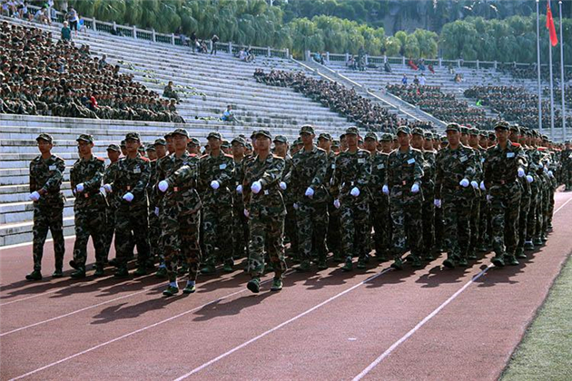 标兵就位后,阅兵式正式开始。国防生方队为队列队伍打头阵,各营方队紧随其后。参与检阅的同学们英姿飒爽,器宇轩昂。他们抬头挺胸,迈着整齐的步伐,彰显着新青年的自信与风采。