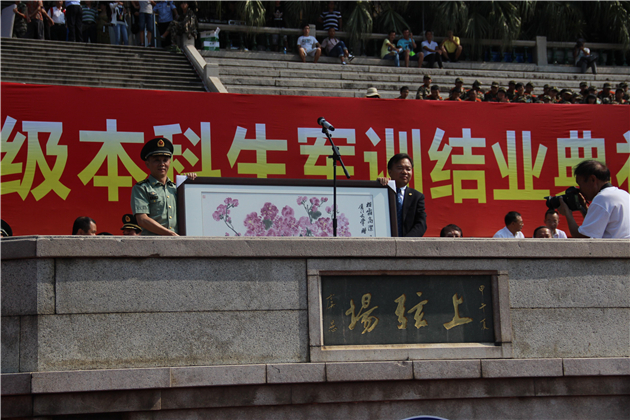 表演结束后,由校党委副书记林东伟进行军训总结。他对本次军训中同学们的表现予以了高度肯定,并对本次参与教学工作的承训官兵致以最真挚的感谢。接下来由副校长邬大光宣读军训表彰名单。获奖的教导员、承训官兵以及同学代表依次上台接受表彰。最后,由校方代表与承训部队代表进行赠礼仪式。至此,厦门大学2015届本科生军训结业典礼圆满落幕。