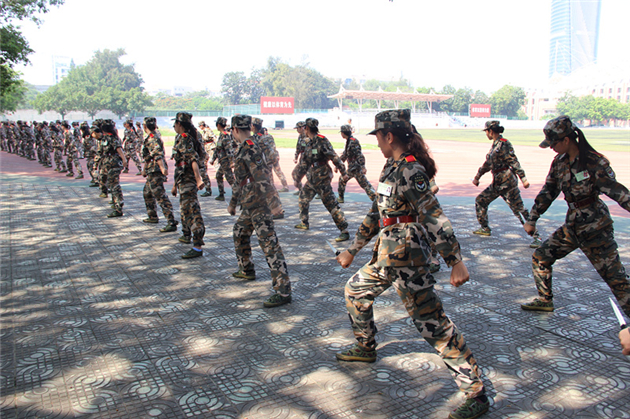 匕首操方阵可谓是特殊方阵中一抹亮丽的风景线,分为弓步上刺、马步侧刺、闪身反刺、上步斜刺、转身后刺、上防侧刺、换刀下刺、绊脚下刺等招式。都说“巾帼不让须眉”,女同学们将军人的柔与刚完美地糅合在匕首操的一招一式中,刚硬中不失柔软,优美中不失气度。