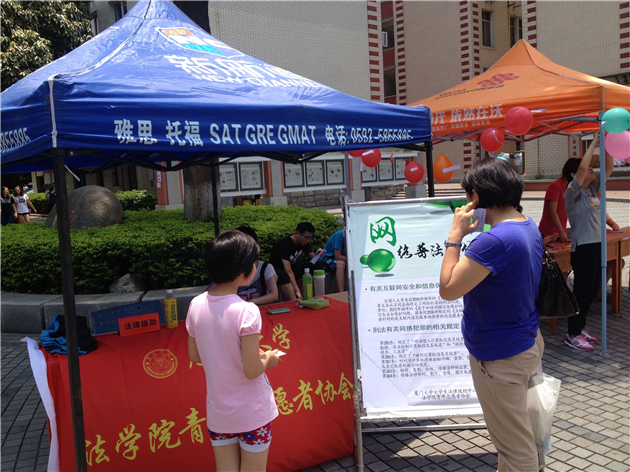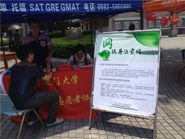 7月13日上午,厦门大学“清朗网络·我来护苗”线下活动在三家村广场展开。yl8cc永利官网应共青团厦门大学委员会与厦大团委青年媒体中心之邀,与其他兄弟院系共同参与其中。yl8cc永利官网青年志愿者协会与厦门大学大学生法律援助中心通过设点宣传并提供法律援助的形式,进行主题为“清朗网络·我来护苗”的网络普法宣传,取得不错的效果。