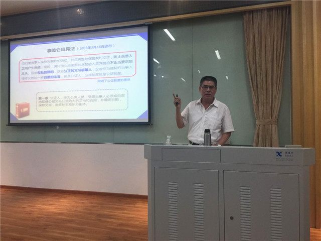 首先,苏国强主任介绍了国内外公证制度的历史沿革及我国公证制度的现状。从国际上看,公证制度起源于古罗马时期的代书人,后来法国实现分散的公证职能一体化,形成了现代公证制度的雏形。到了法国资产阶级大革命时期,现代公证制度正式形成。中国的公证制度起源于古代的中人制度,在民国时期形成现代公证制度,后被台湾地区沿用。接着苏主任介绍了目前我国公证制度的现状。除了历史沿革和现状之外,还简要介绍了大陆法系公证制度和英美法系公证制度的区别以及拉丁公证制度。