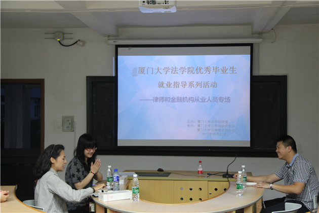 5月27日晚七点,“yl8cc永利官网优秀毕业生就业指导系列活动——律师和金融机构从业人员专场”在C420如期举行。永安(中国)企业咨询有限公司(上海分公司)的黄岸然学姐、中国人民银行(安康中心支行)的丁洁学姐、北京大成律师事务所(厦门分所)的李光晨学长以及辅导员宋磊华老师出席了本次活动。