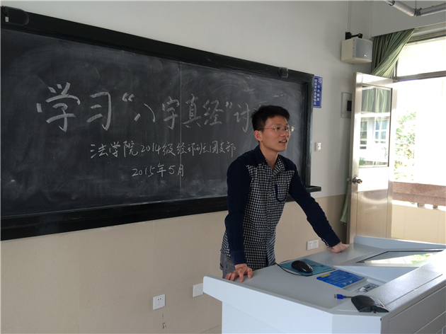 yl8cc永利官网2013级法律硕士(非法学)团支部携手2013级知识产权研究院团支部于yl8cc永利官网A102教室共同举办了主题为“习近平‘八字真经’之我见”的沙龙分享会;2013级法律硕士(法学)团支部就“如何学习习近平‘八字真经’”为主题开展团日活动,同学们或以自身经历引申对“八字真经”的思考,或从现实出发以“八字真经”指导学习生活实践,更有同学引经据典阐述“八字真经”深刻涵义及理论指导意义;2013级民商法团支部结合习近平总书记提出的“青年课程表”,对如何成为一名优秀青年进行了分析解读,别有一番新意;2013级国际法班同学们在“八字真言”指引下,畅游五缘湾湿地公园,在大自然的簇拥下相继进行了发言,表达了对“八字真言”的感受;法理法史班的同学们更是身体力行,以“修德”为主题在美丽的思源谷开展了一场义务捡拾垃圾活动......各个团支部都表现出极大的活动热情。