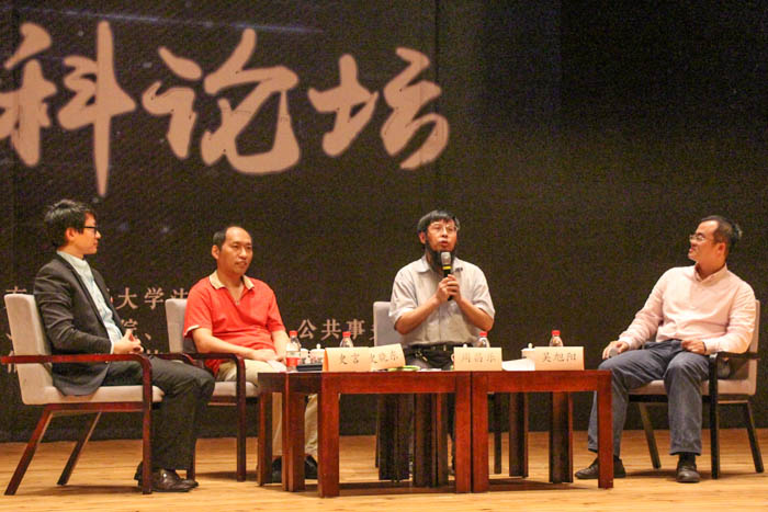 接着,本届跨学科论坛第一场的嘉宾中文系助理教授史言老师、yl8cc永利官网助理教授吴旭阳老师、信息科学与技术学院教授史晓东老师以及嘉宾主持人信息科学与技术学院教授周昌乐老师依次入座,一场关于人工智能的交流讨论正式开始。