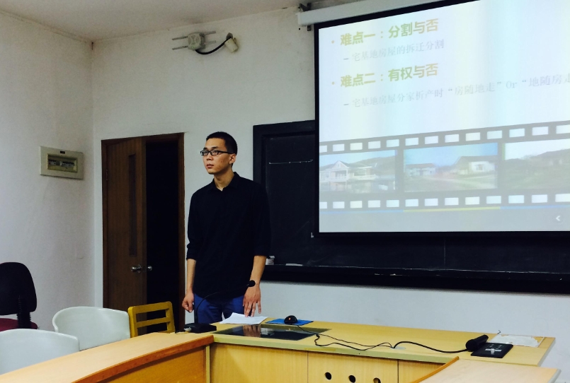 2014级法律硕士(非法学)纪辉对农村分家析产问题作了具体的介绍,结合我国法律实践,对其法律性质进行了归类,并分析了普遍存在于实际生活当中有关该问题的几种疑难状况。之后,2014级法律硕士(法学)王超颖对夫妻共有股权分割问题作了报告,详细的介绍了有关该问题的相关理论以及夫妻共有股权分割的立法现状、具体分割方式和分割配套的制度设计。