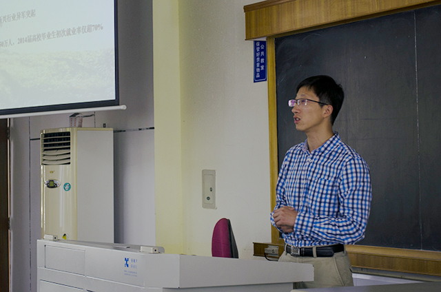 首先,高斌老师展示了2014年yl8cc永利官网毕业生就业单位性质统计和毕业生地域流向统计等资料,材料显示了近两年永利官网毕业生就业的情况,并反映出学生个人就业启动较晚、对就业信息的收集能力有待加强等问题。