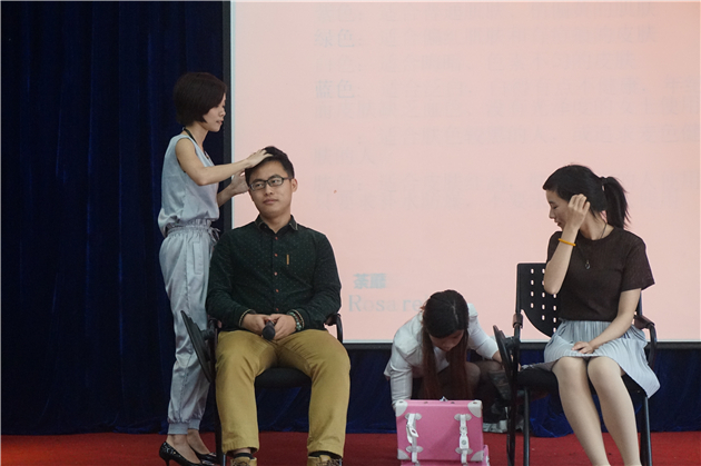 在齐梦露老师讲述完上述礼仪要求后,虞雅晴老师主要针对职场上所应注意的装束要求进行了演示。首先对男生的发型和服装方面提出了相应的建议,让男生在职场中显示出干练精神的状态。紧接着虞老师完整展示了女生职场妆容的成型过程,得到了在场同学们的热烈回应。