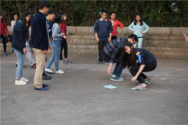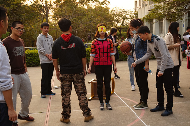 经过短暂的休整,大家的热情继续升温,紧接着进行下一个游戏“仙人指路”。由一名蒙住眼睛的队员在另一名同学的语言指导下通过障碍重重的通道,规则是不能触碰到障碍物。跟随口令,前后左右,好不热闹。进行完这个项目,到了最后一个项目“撕名牌”。每个队员背后贴有各个师门名称的名牌,规则就是撕掉对方队伍的名牌。看似简单的规则,可是进行起来却一点儿也不简单,男队员要保护好女队员,而各队员又要小心被其他队伍合围,而陷入四面楚歌的境地。大家相互追逐,灵巧躲闪,发挥自身优势进行“作战”,可谓劳心劳力,场边观众也不由为选手们捏一把汗,最后的这一赛程将整个活动推向了高潮。