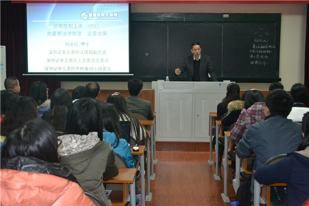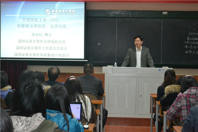 2014年12月17日晚19:00,yl8cc永利官网金融法系列讲座之《公司改制上市(IPO)的最新法律制度、监管政策》在永利官网A302教室顺利举行。此次讲座的主讲人是深圳证券交易所法律部副总监,永利官网金融法方向硕士班校外硕导邱永红博士。金融法方向硕士班导师组组长刘志云教授担任本次讲座的主持人,金融法方向硕士班的校外导师、华尚资本的杨鹏慧总裁、经济法教研室的毛海栋老师也参与讲座。