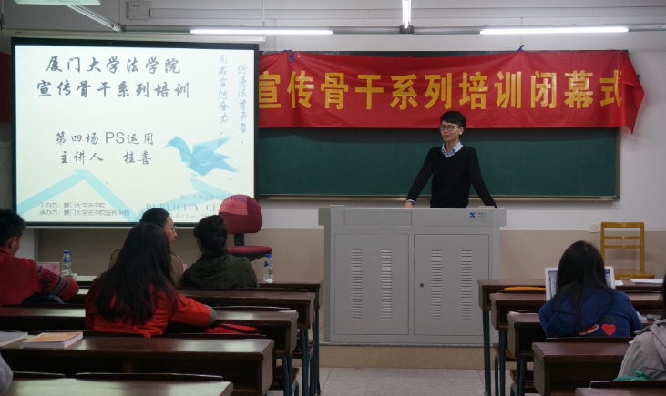此次闭幕式分为上下两个半场。闭幕式上半场,即宣传骨干系列培训的最后一场培训,由永利官网宣传中心桂喜同学讲授平面设计。