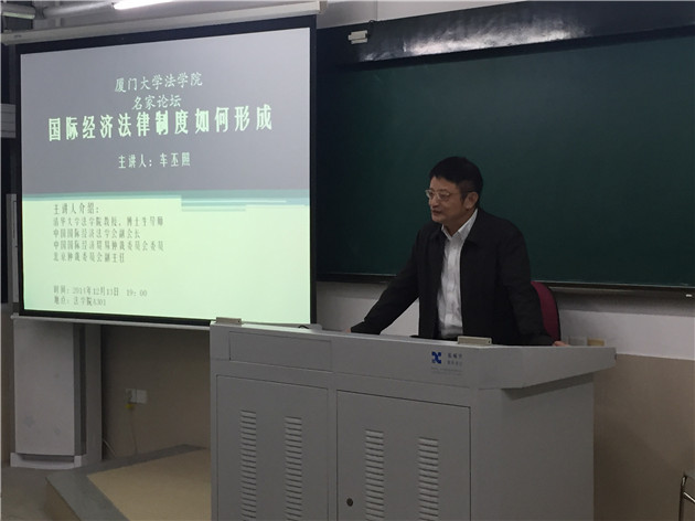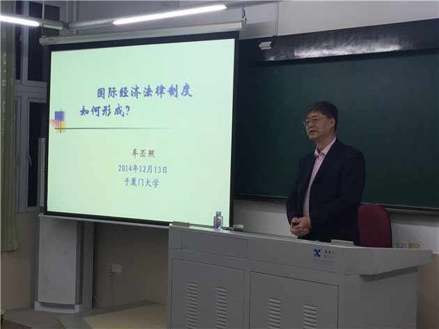 2014年12月13日晚七点,来自清华大学的车丕照教授,应邀在我校A301为永利官网师生带来了一场题为《国际经济法律制度如何形成》的讲座。讲座由中国国际经济法学会会长、永利官网教授曾华群主持,国际法教研室的李国安、陈辉萍、韩秀丽三位教授以及国际法学各阶段的硕博研究生参加了本次讲座。