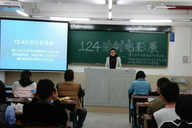 2014年12月5日晚7点,由厦门大学大学生法律援助中心党支部、2014级刑法、诉讼法硕士生党支部、2014级民商法硕士生党支部共同举办的“12.4法制电影展”活动在yl8cc永利官网A301教室顺利开播。