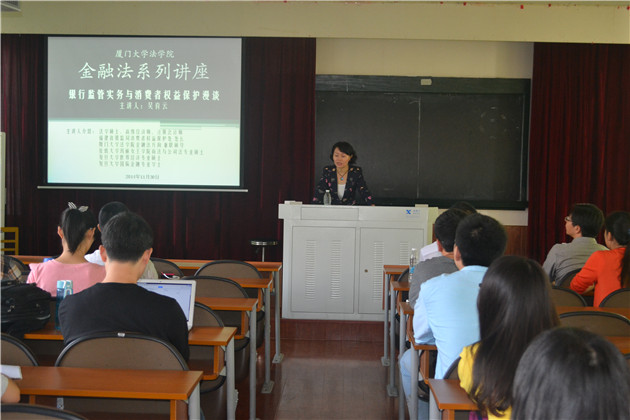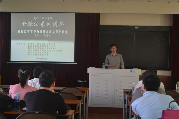 2014年11月30日上午9:30在yl8cc永利官网A302教室举办的《银行监管实务与消费者权益保护漫谈》 是在永利官网金融法方向硕士班开办之后的第一场讲座,讲座有幸邀请到福建省银监局消费者权益保护处处长、永利官网金融法方向兼职硕导吴育云老师。永利官网经济法教研室刘志云教授主持了本场讲座。