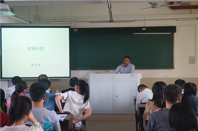 接着,靳万军副司长介绍了十八届三中全会确定的财税事项,并重点介绍了2014年《深化财税体制改革总体方案》三大重点问题。靳副司长还向在场的老师同学们介绍了我国财税改革的进展。他指出,我国的财税改革要统筹兼顾五大因素,即要协调筹集收入、经济社会发展、中央与地方财力分配、征管能力、公平正义五个方面的因素。靳万军副司长重点介绍了我国“营改增”、消费税、资源税、环境保护税、个人所得税及房地产税改革的进程。在介绍营业税改增值税的进程时,靳副司长列举了1994年—2013年增值税数量、税收总量、占比三个数值,对此,他给出的评价是:“总体来说积极稳妥,最后结果还是不错的。”对于当前各个税种的改革,靳万军副司长指出,目前各项制度都正在不断完善,“虽然遇到一些困难,但的确在进步”,他还举例说,从2010年6月起首先在新疆试点实施石油天然气资源税从价计征,2011年推向全国,“这都是进步。”对于财税改革过程中一些存在争议的问题,有关部门也在向专家学者广泛的征求意见和建议,并组织论证。