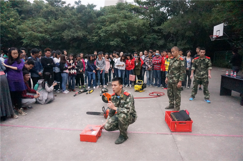 防灾演练进行到第二部分,消防中队的部分消防员先后为大家进行扩张器、顶杆、金属切割机等消防装备的展示,同学们听得十分认真,许多人还亲自上前动手感受。接着消防队员又进行了消防水袋连接的演示。