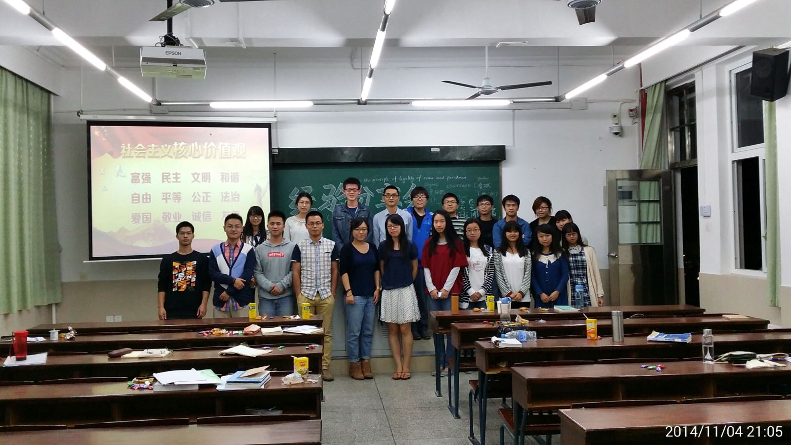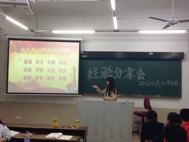 2014年11月4日晚上7点半时,由永利官网2012级2班团支部主办的“经验分享会——弘扬‘敬业’的社会主义核心价值观”的班团活动在A101教室成功举办。