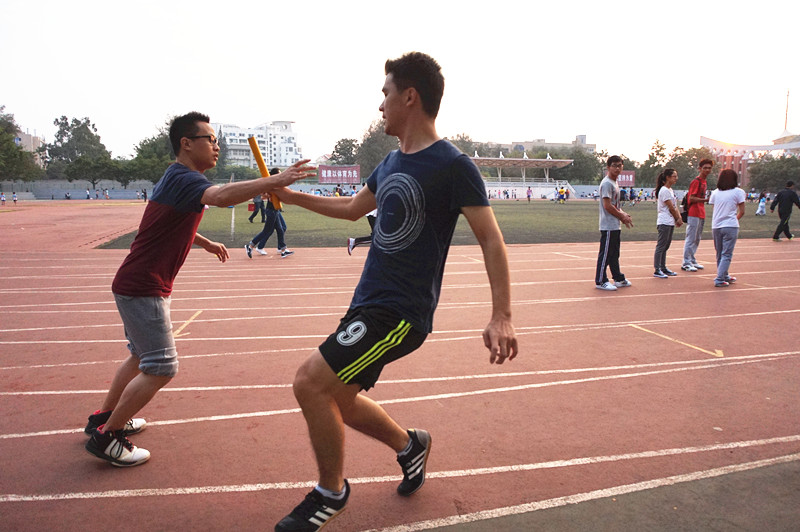 在场地的另一侧,正进行着30*60m的男女混合接力训练,只见两组队员们蓄势待发,拿到接力棒后奋起向前,如离弦的箭一般飞奔而去,郭老师一边鼓励运动员,一边指导要训练得当,不能在大赛之前出现伤病。