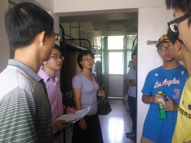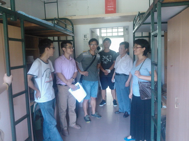 在走访芙蓉十三男生宿舍时,刚刚收拾完或正在收拾宿舍的同学们没有想到自己学院的老师们会造访宿舍,不禁有些紧张。周老师等三位老师仔细走访每一间宿舍,询问同学们在入住和饮食方面是否遇到什么问题。有的同学及家长坦言自己适应得很好,也对宿舍情况很满意,也有的同学提出了自己在入住时遇到的问题。针对每位同学的问题,三位老师都相应地提出了可行的解决办法,比如对于宿舍的门窗完损程度、天花板、空调等问题,一一地提供了报修的途径。有的新生尚未全部在宿舍,老师们也借此了解了新同学对自己舍友的了解程度。欣慰的是,同学们对自己的舍友都有了基本了认识,并且舍友之间的联络也已经建立,这为今后的宿舍生活打下了很好的基础。当走访到有少数民族同学的宿舍时,老师们也很细心地询问并为同学讲解学校为少数民族学生在饮食、生活方面提供的服务和设施。