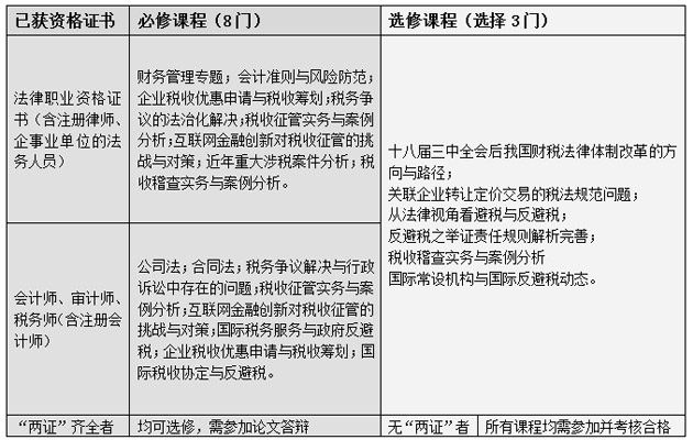鉴于参加税务律师培训的学员已经在本专业和领域具有相应的实践经验和资质证书,大多数至少获得律师资格证和会计师资格证中的一个,因此课程设计分为核心课程和选修课程,获得以上“两证”中的一个的学员可以根据自身专业情况选择修读;对于“两证”齐全的,在参加培训后可以免于参加测试,通过论文答辩的方式结业和颁证。