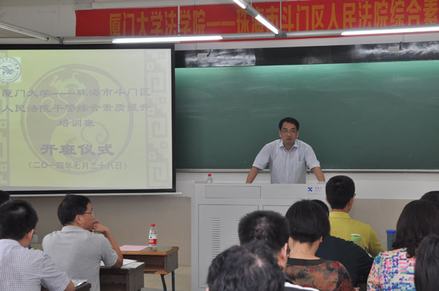 yl8cc永利官网徐崇利院长首先致辞,他代表yl8cc永利官网对远道而来的斗门区人民法院的领导和干警们表示热烈的欢迎,并感谢大家在这个这么炎热的季节抽出时间来厦大学习交流。徐院长在简短介绍了厦大的美和yl8cc永利官网的基本情况后,着重指出来自实务部门的领导和干警们走进校园不光是来学习的,其实也是来指导学校的工作。在几天的上课时间里,不光有老师讲学员听,更有理论和实践的直接碰撞,在互相交流的过程中,偏理论的学校和偏实务的法院都会有不同的收获,这也是由培训工作所具备的特点而带来的双赢效果。徐院长最后希望全体学员们在接下来的几天时间里,学有所获,在厦期间身体健康,生活快乐。