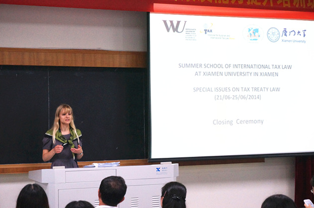 考试结束后的闭幕式上,WTS的上海办事处负责人吴先生向暑期班致辞。廖益新老师高度评价维也纳经济大学奥地利及国际税法研究中心的教学工作,也为学员们的学习热情所感动。Ina Kerschner祝贺学员们圆满完成学业,并与大家相约维也纳。朱炎生老师向学员们的认真和坚持表示感谢,也向辛勤工作的志愿者们表示感谢,并祝福大家在厦门大学有一段美好回忆。