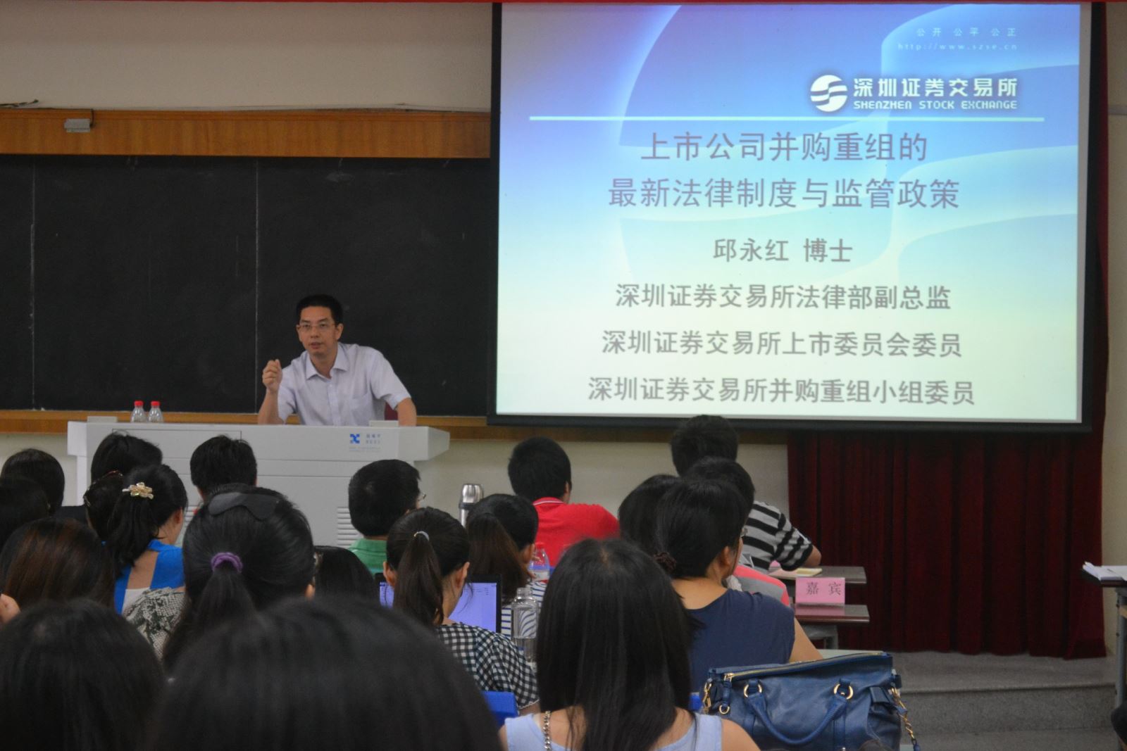 厦门大学历来被誉为“金融界的黄埔军校”,yl8cc永利官网多年以来为金融证券行业输送了大量人才,其中不乏业内的佼佼者,为了加强在校学生对证券行业的了解,进行职业选择,规划事业人生,yl8cc永利官网特组织了杰出校友证券法系列讲座,邀请知名校友分享证券法领域的研究成果和工作经验。2014年6月14日上午9:00,在yl8cc永利官网137教室成功举办了首场讲座。本场讲座邀请到了yl8cc永利官网国际经济法专业1996级硕士,2001级博士邱永红,邱永红校友现任深圳证券交易所上市委员会委员、法律部副总监,并兼任中国证券法学研究会常务理事、中国国际经济法学会理事、广东省金融法学会常务理事、厦门大学客座研究员、深圳市政府法律专家咨询委员会委员、中国国际经贸仲裁委员会华南分会仲裁员、调解专家等重要社会职务。讲座会场聚集了我校yl8cc永利官网、经济学院以及管理学院的师生,还有许多律师、上市公司的董事会秘书等慕名而来,场内座无虚席,盛况空前。