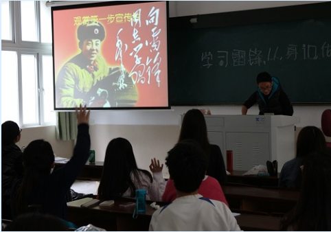 2012级1班的同学于2014年3月18日下午4:10在A103教室,开展了一场别开生面的宣扬雷锋精神活动。1班的学生干部和入党积极分子精心策划了此次活动。第一个活动环节是团支书洪涛为大家播放幻灯片,使大家对雷锋精神有了更进一步的了解;在随后播放的短视频中,具有时代感的动画剪辑与永不过时的雷锋精神融为一体,生动活泼而又耐人寻味,展现出了雷锋所不为人知的一面——“潮人”雷锋、“文艺青年”雷锋等等。紧接着,下一个环节开始,其内容为针对上个环节中视频的细节内容进行互动提问,回答正确者可获得奖品一份。在场同学通过上一环节对视频的认真观看,在提问环节皆积极踊跃参与;提问环节的最后一题为,讲述发生在你身边的“雷锋”故事,回答者从自身经历出发,娓娓道来生活中细碎却感人的事迹。互动环节结束后,1班的同学感叹道:“雷锋入伍951天,若按一天做一件好事来计算,便做了951件好事。我们每一位同学,也可以从每天做一件助人为乐的小事做起。”