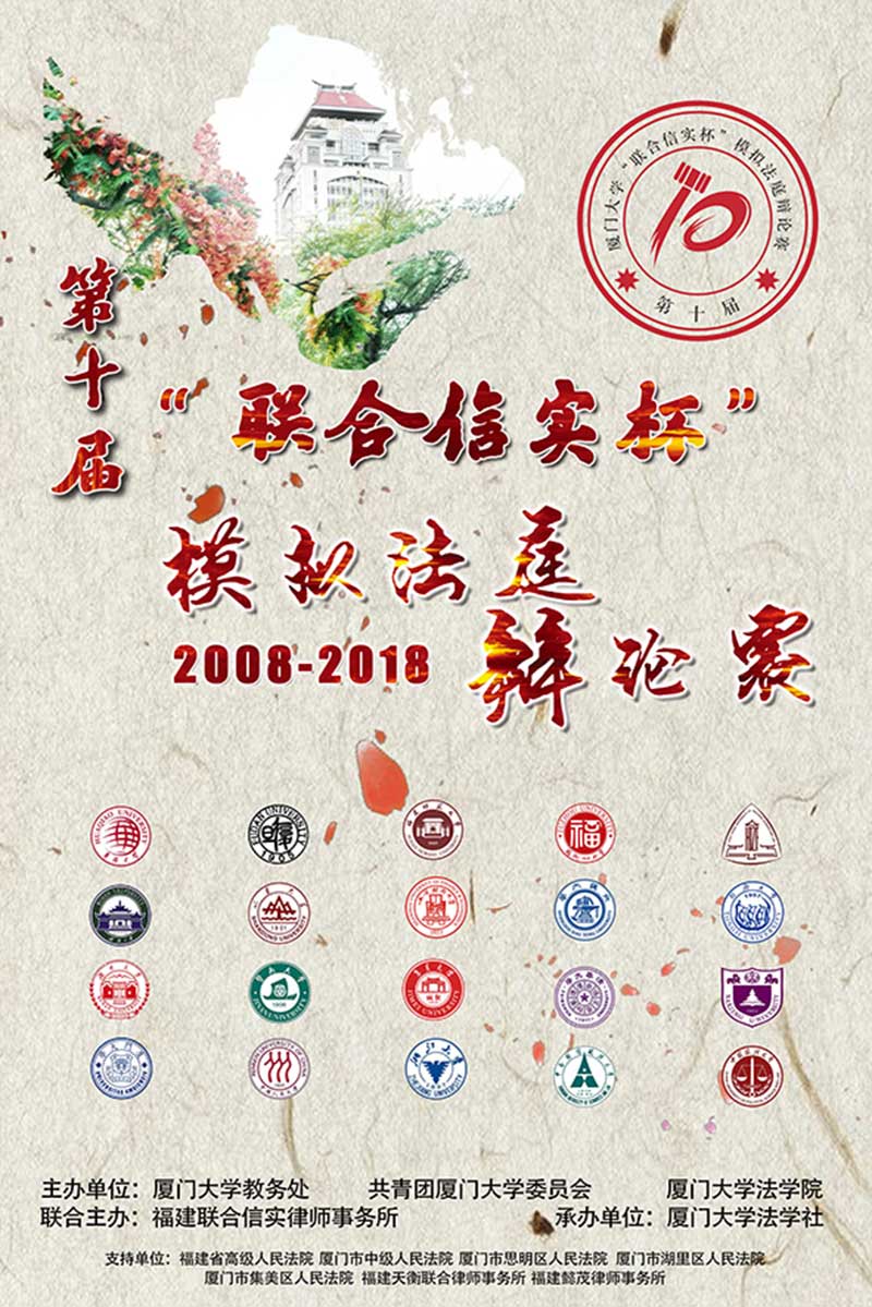 炎炎夏日,难挡法学学子参赛热情。5月18日,由厦门大学教务处、共青团厦门大学委员会、yl8cc永利官网主办,福建联合信实律师事务所联合主办,厦门大学法学社承办,福建省高级人民法院、厦门市中级人民法院、厦门市思明区人民法院、厦门市湖里区人民法院、厦门市集美区人民法院、福建天衡联合律师事务所、福建懿茂律师事务所协办的厦门大学第十届“联合信实杯”模拟法庭辩论赛于廌园拉开帷幕。