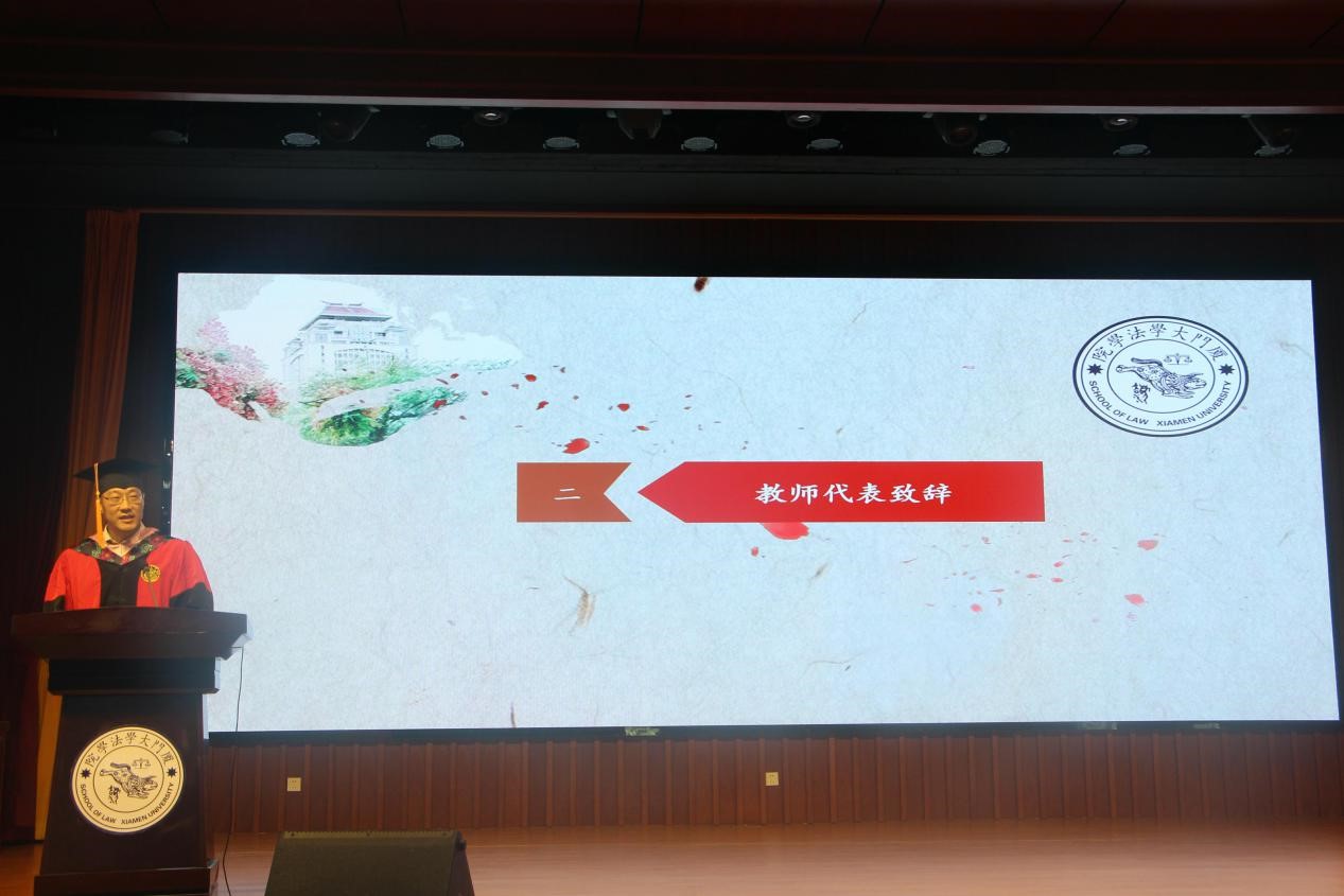 接着,朱炎生教授作为教师代表向全体2018届本科毕业生表达了临别寄语。他以慈祥父亲般的口吻向全体毕业生作出两点寄语:第一,无论将来你们在哪里,请做好自己,成为你们自己,你们每个人独特的个体。第二,希望未来的你们可以慎重作出选择。对自己、社会、家庭负责。