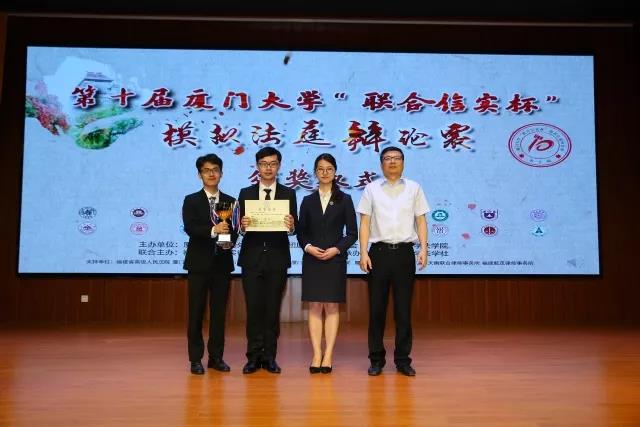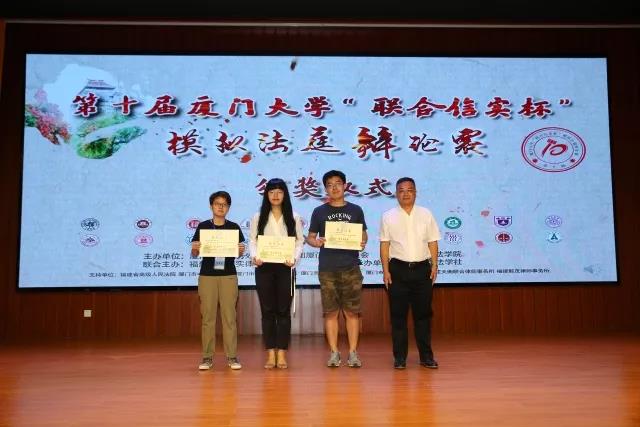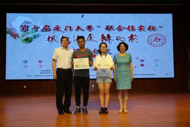 厦门市思明区人民法院庭长王叶萍、副庭长林鸿,厦门大学教务处副处长陈雪芬、yl8cc永利官网副院长李国安为优秀辩手颁奖