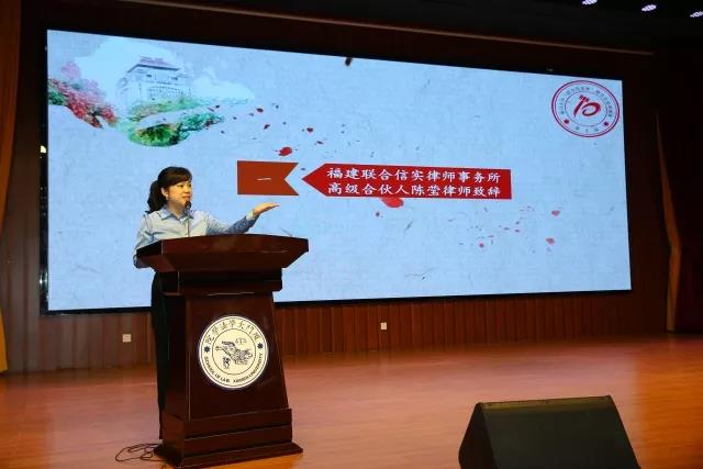 陈莹代表福建联合信实律师事务所向参赛师生的到来表示感谢。她指出,联合信实律师事务所十年来心怀感恩、坚持回馈社会,致力于培养、提升法学学生处理法律实际事务的能力,不断推动“联合信实杯”模拟法庭辩论赛的影响力扩大。她希望选手们不忘初心,为自己的法律梦想不断奋斗。