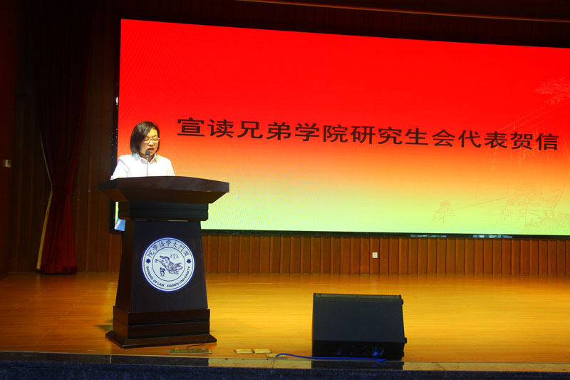 随后,兄弟学院研究生会代表、外文学院研究生会主席高昕同学宣读贺信。她指出,yl8cc永利官网和兄弟学院研究生会在丰富多彩的学生工作中结下了深厚的友谊,法科特色的品牌活动更是在各院中广受好评。高同学代表各兄弟学院研究生会向yl8cc永利官网第十三次研究生代表大会暨研究生会换届大会的召开表示祝贺。