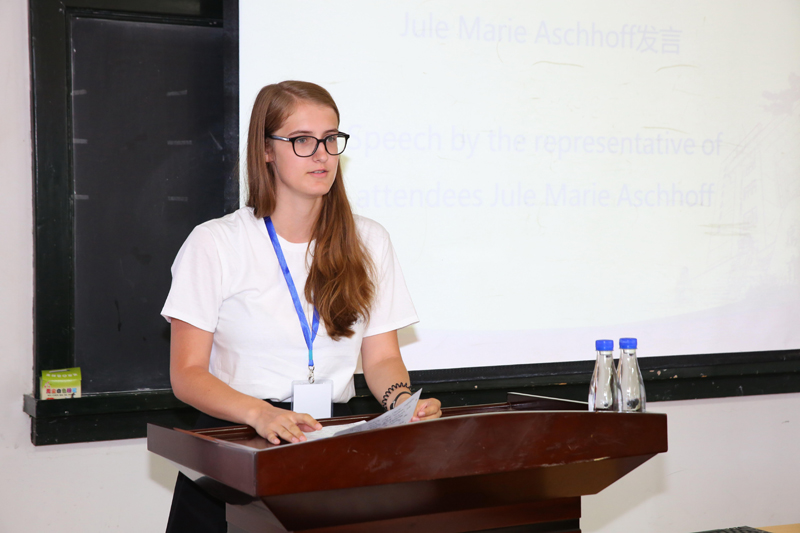 夏令营学员代表、特里尔大学学生Jule Marie Aschhoff作为学员代表用中英文发言,她介绍了自己的汉语学习经历,并表达了对本次中国法夏令营的美好憧憬与期待。