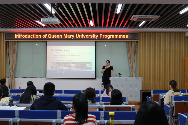 讲座上,Zi Parker女士首先从历史沿革、国际化发展、教学环境、学科布局、学制安排等方面对伦敦玛丽女王大学作了简明扼要的介绍。而后,她着重介绍了玛丽女王大学“4+1”项目、“1+1+1”项目、暑期项目以及博士项目。