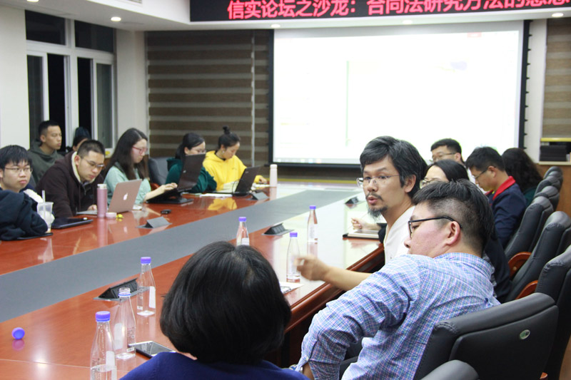 首先,陈教授分享了个人研究路径,从“纯民法”到“民法+商法”,进而提出“法释义学+法律继受轨迹之探寻+比较法+法律史+英美法+法律思想” 的模式。在此,陈教授也提出关于外语学习的建议,陈教授建议加强对德文、英文和日文的学习。之后,陈教授讲述了合同法体系之建构和财产法研究中心,对比了契约法和其他债之关系,指出在财产法研究中对合同的研究偏少,对合同各论和新型合同类型的研究少之又少等问题。在此基础上,陈教授总结了合同法研究中的新课题与新挑战,他提出要建构以企业为中心的民法体系。