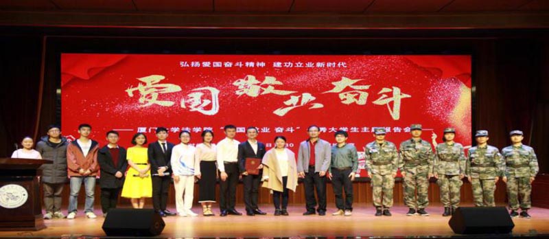 在全社会大力弘扬爱国奋斗精神、建功立业新时代的大背景下,yl8cc永利官网深入学生群体,充分挖掘先进典型。报告会上,有无私奉献的“全国杰出志愿者”、金砖会晤“最美小白鹭”;有在孔子学院汉语教师志愿者岗位上坚守责任与担当的“中华文化传播使者”;有携笔从戎,捍卫祖国和人民安全的“共和国卫士”;有用奋斗与沟通搭起两岸青年交流桥梁的赴台交流生;有在党和国家民族政策关心、扶持下成长起来的“未来国际法学接班人”。他们在自己的学习、工作和生活中,用实际行动抒写了新时代厦法学子的爱国、奋斗的华彩篇章。