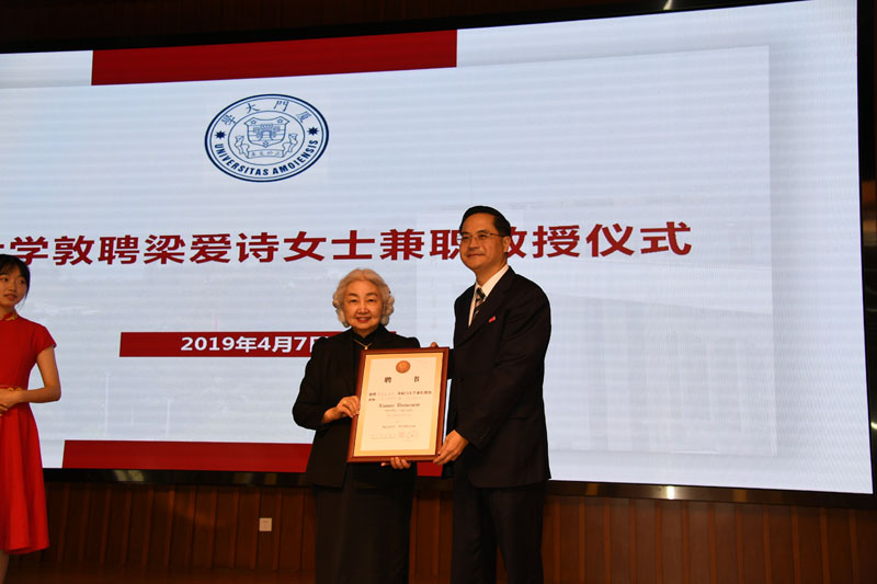 仪式上,邱伟杰副校长为梁爱诗女士颁授厦门大学兼职教授聘书及南强学术讲座纪念牌。