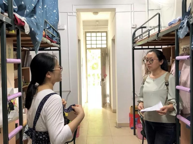 走访中,杨璐老师详细询问了研一同学们新学期的生活、学习情况,勉励同学们做好规划,珍惜时间,宋磊华老师对毕业班同学论文写作及答辩压力、实习进展、毕业走向进行了解,关切慰问同学们的身体与心理健康状况。检查宿舍违规电器、大功率电器使用状况,对不规范用电进行批评指导与监督。对卫生优良、环境整洁的宿舍同学予以表扬。并向宿舍管理工作人员跟踪了解重点同学的日常生活情况。