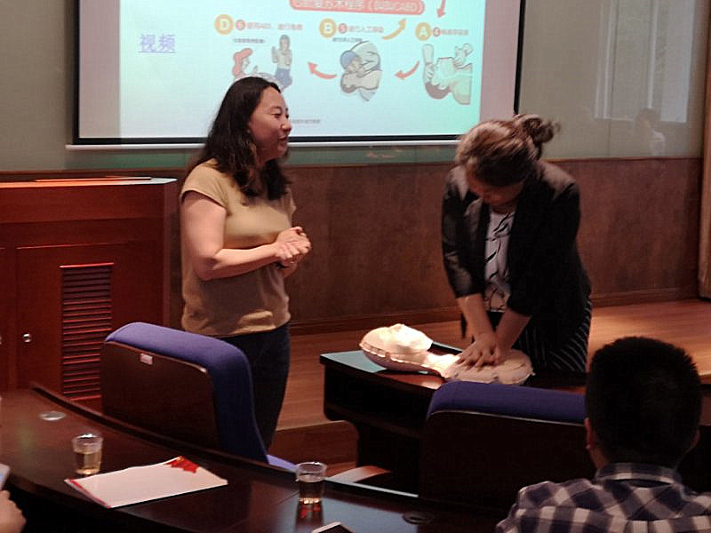 在活动的急救知识培训环节,余丹老师首先列举了几个因急救不及时而不幸死亡的案例以及一些相关统计数据,警醒大家具备一定的心肺复苏知识在紧急情况下是十分必要的。同时余丹老师也一再强调,心肺复苏技能要经过正规、权威的培训,以达到预期的急救效果。