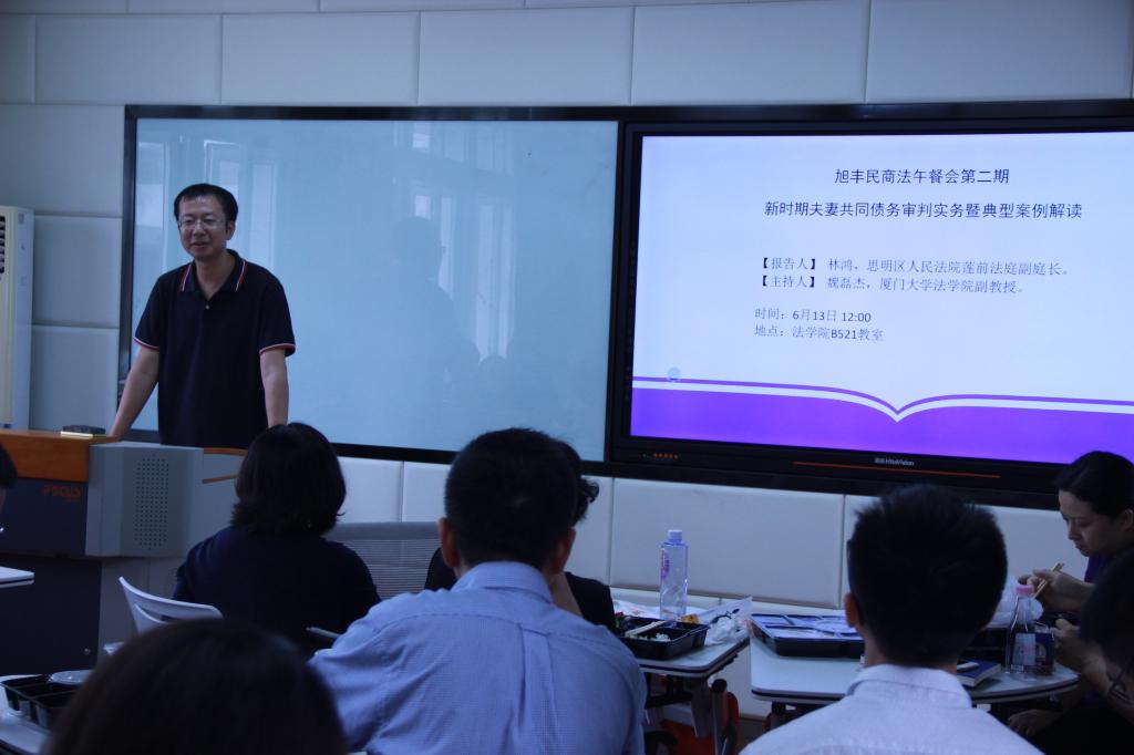 2019年6月13日中午,第二期旭丰民商法午餐会于yl8cc永利官网B521教室顺利举行。yl8cc永利官网民商法教研室部分教师们和福建旭丰律师事务所的律师共进午餐,一同听取了思明区人民法院莲前法庭副庭长林鸿法官的报告发言。