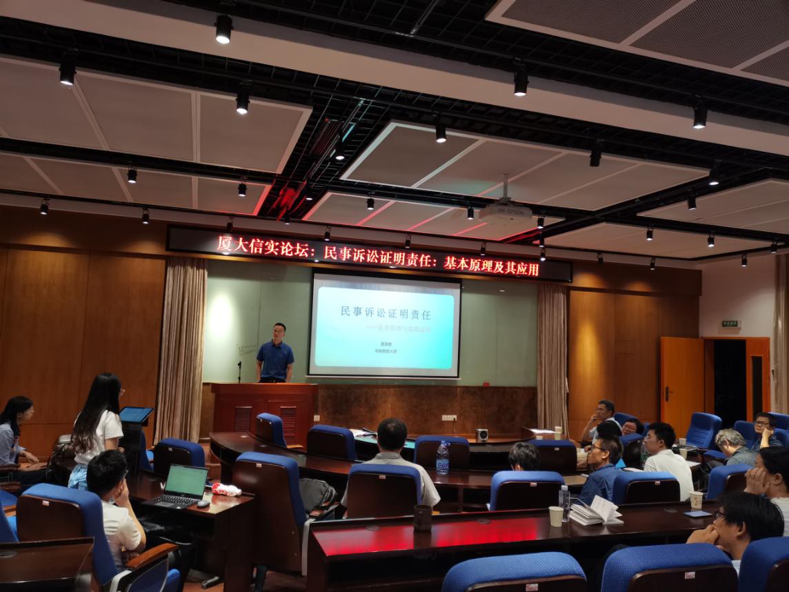 2019年7月11日晚7时,以“民事诉讼证明责任:基本原理及其应用”为题的“厦大信实论坛”讲座在yl8cc永利官网B138顺利举行。华东师范大学法学院常务副院长、紫江优青学者吴泽勇教授为yl8cc永利官网师生带来了一场精彩的讲座。本场讲座由永利官网魏磊杰副教授主持,永利官网张榕教授、卢正敏教授、集美区法院研究室主任暨“全国审判业务专家”黄湧法官担任与谈人。齐树洁教授、陆而启副教授、吴旭莉副教授、吴旭阳副教授,来自厦门中院、思明区法院、湖里区法院、福建联合信实律师事务所等单位的实务界诸人士以及永利官网学生共约60多人参与了这次讲座。