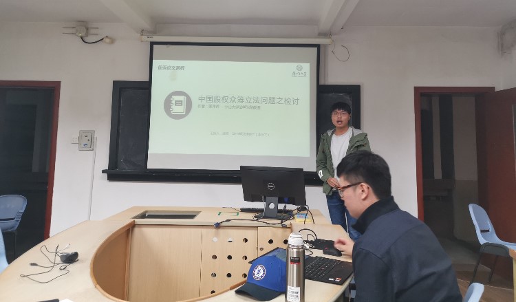 第三位分享的是裴琦同学。他赏析的文章是中山大学法学院副教授董淳锷老师的《中国股权众筹立法问题之检讨》。这篇论文在选题方面兼具了时效性、实践性和价值性;在结构框架方面,以两大问题为中心展开论述,结构严谨,逻辑清晰;在论证方法方面,综合运用对比分析法、实证分析法、社会调查法等多种论证方法,论证有力;从而得出创新性结论。肖老师对其中的经济学假设这一研究方法颇感兴趣,仔细询问并提出自己对于经济学假设的看法。
