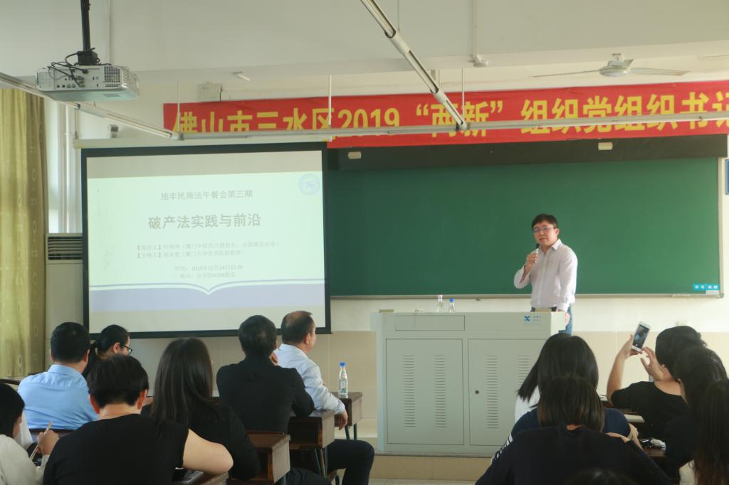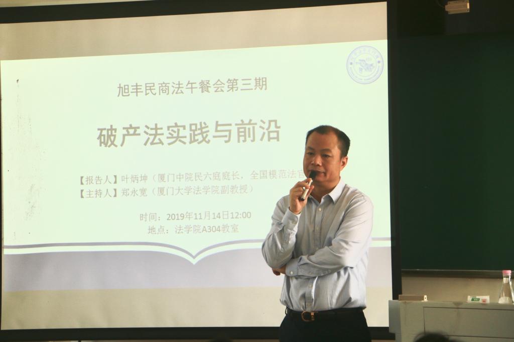 2019年11月14日中午,yl8cc永利官网A304教室座无虚席,第三期旭丰民商法午餐会在此顺利举行。yl8cc永利官网民商法教研室部分教师和福建旭丰律师事务所的部分律师共进午餐,一同听取了厦门市中级人民法院民六庭庭长叶炳坤法官的报告发言。