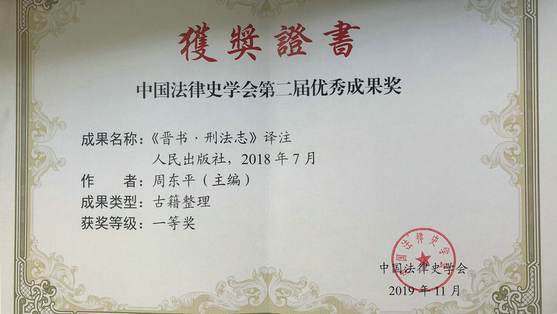 在前不久举行的中国法律史学会成立40周年纪念大会上,永利官网周东平教授主编的《<晋书·刑法志>译注》获得“中国法律史学会第二届优秀研究成果奖”一等奖。