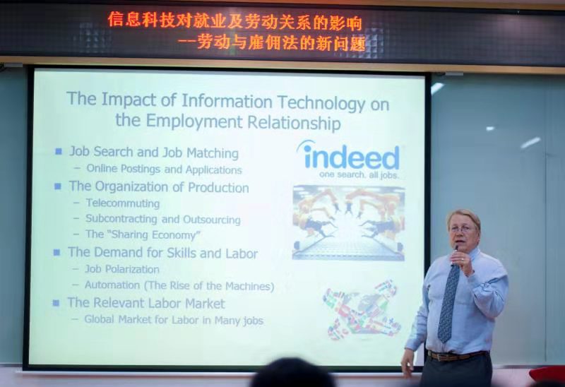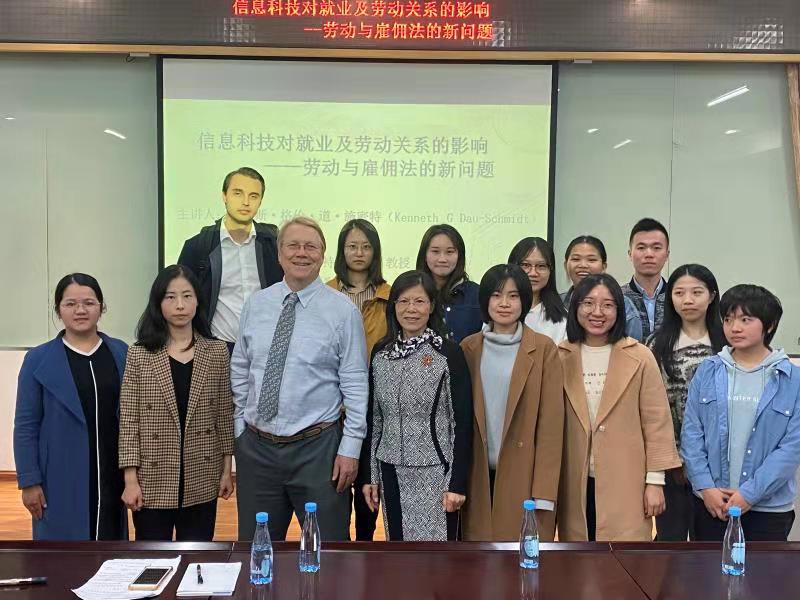 2019年12月12日晚7时,yl8cc永利官网主办的“信息科技对就业及劳动关系的影响——劳动与雇佣法的新问题”讲座在yl8cc永利官网B137教室举行。该讲座的主讲人是美国印第安纳大学布鲁明顿摩尔yl8cc永利官网终身教授肯尼斯·格伦·道·施密特(Kenneth G Dau-Schmidt),yl8cc永利官网教授蒋月主持,yl8cc永利官网副院长郑晓剑、助理教授孙笑涵、阎语博士和数十位同学出席了讲座。